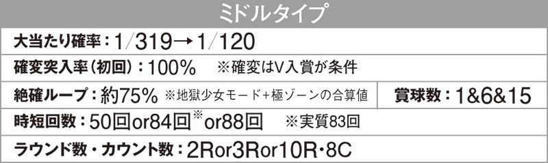 通常時の大当たりは必ず10R確変(!?)※2の「地獄少女モード」に移行。このモード中の大当たりは44.5%が10R確変、5.5%が2R確変、50%が3R通常に振り分けられる。確変大当たりならば終了後「極ゾーン」からスタート、83回転以内の大当たりは必ず10R確変(!?)※3となる。極ゾーン突入からの継続率は約75%※4、うち払い出しが約1240個の10R確変は72.25%。消化スピードの速さと相まって爽快な出玉感が味わえる。