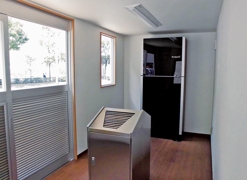 コンテナ内は独立した密閉空間で、高性能なプラズマ脱臭機を装備。プラズマ脱臭機が臭い成分を99%除去し、煙を浄化して屋外に排出する。そのため『喫煙トレーラー』の傍でも煙や臭いを感じることはない。