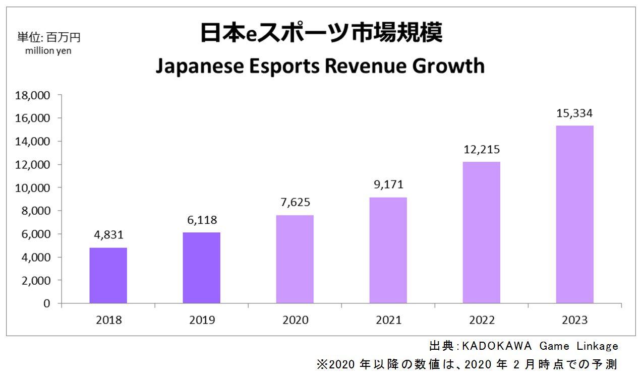 KADOKAWA Game Linkageの推計によると2019年の日本国内eスポーツの市場規模は前年より26.6%増え61億1800万円。2023年には150億円を超えると予測している。高速・大容量化、低遅延、多数端末接続が特徴の次世代モバイル通信「5G」が開始されることで、モバイルのe スポーツが活発化するとともに、家庭用ゲーム機・PC 向けe スポーツタイトルが今後モバイル端末でも展開されることが見込まれる。