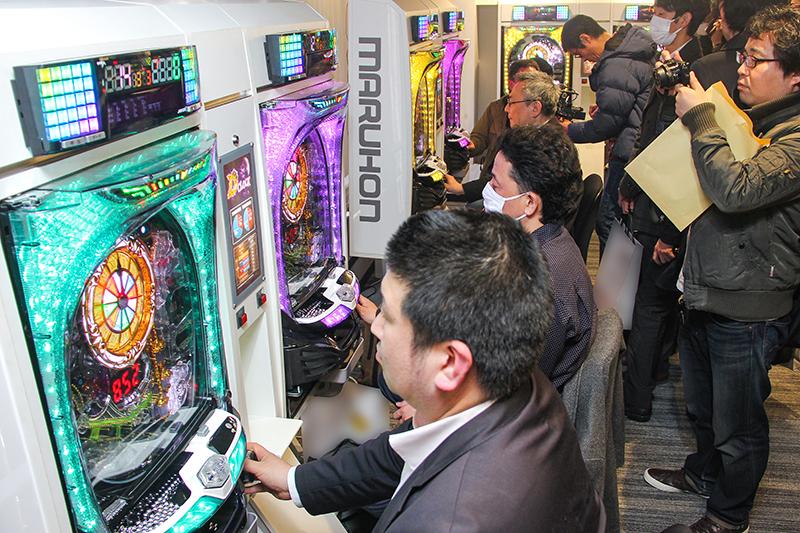 マルホン工業は2月17日、東京支店ショールームで新機種『P D-CLOCK』のプレス発表会を開催した。大きな時計役物が目立つ同機は、当たりやすさと一撃性を併せ持つライトミドルタイプの一種二種混合機だ。