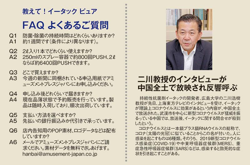 こうした状況の中で、新型コロナウイルス感染対策への対応の遅れが、店舗選びの際のマイナス要因になれば大きな痛手だ。イータック ピュアを使った遊技機や手指の消毒、店内告知など「いまできることをしっかり実行すること」で、「ホール離れ」というイメージ先行の消費行動に対し少しでも歯止めをかけていきたい。