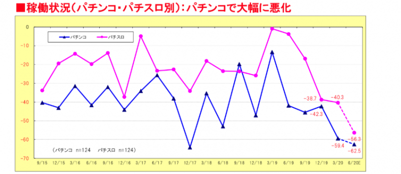 エンタテインメントビジネス総合研究所とシーズが四半期ごとに合同で実施している「パチンコ景気動向指数(DI)調査」によると2020年3月の全般的業況が大幅に落ち込んでいることがわかった。