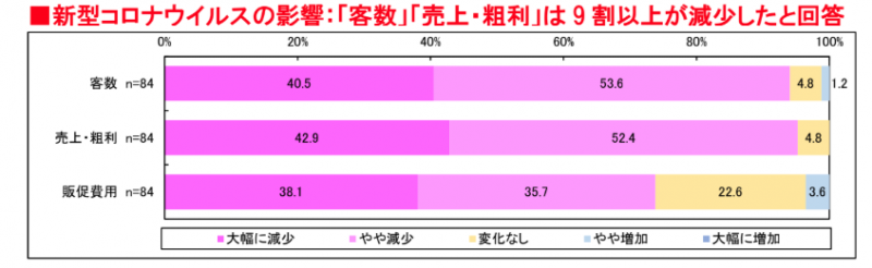 新型コロナウイルス感染拡大を受け、政府が国民に不要不急の外出自粛を要請したり、感染への不安から外出を控える人が増えた。これによりサービス業を中心に多くの業種で業績に大きな影響が出ている。3月12日から27日の間に実施され84社から回答を得た、エンビズ総研とシーズによる合同調査にもそれが如実に表れている。