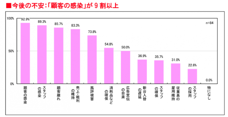 新型コロナウイルスに関する今後の心配は「顧客への感染」が最も多く、次いで「スタッフの感染」「顧客離れ」。前述の通り、顧客への感染やスタッフの感染があれば、休業をやむを得ないと考えている企業が多く、休業すれば必然的に売上・粗利の維持ができなくなるためだろう。