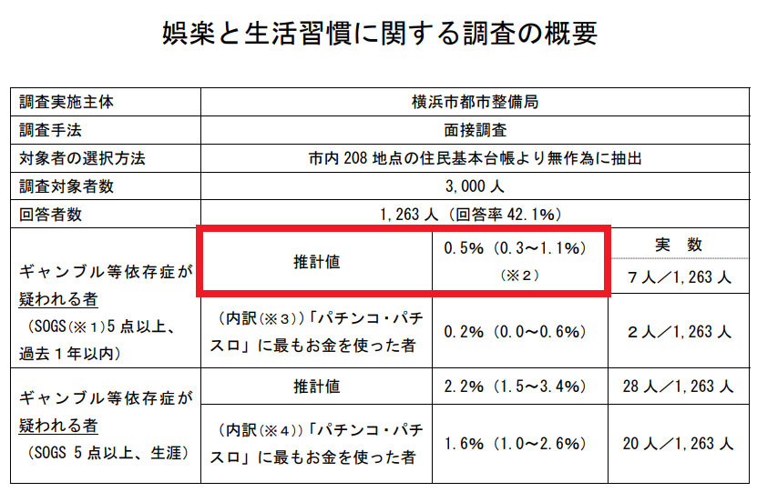横浜市調査 ギャンブル等依存症の疑い 成人の0.5%