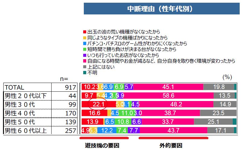 男性の20代では、遊技機の仕様を中断理由に挙げたプレイヤーは2割程度だったが、30代から50代では約3割と多くなり、「自分自身を取り巻く環境が変わったから」を理由に挙げたプレイヤーの割合との差も小さくなっている。特に男性の30代では「出玉の荒い機種がなくなったから」を中断理由に挙げたプレイヤーが22.1%と多い。