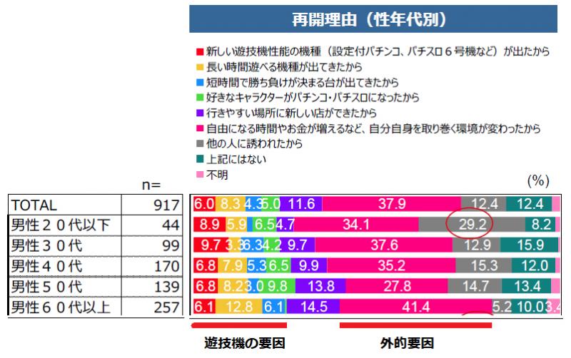 再開理由はいずれの年代でも「自分自身を取り巻く環境が変わったから」が最も多い。男性に限ってみると、遊技機の変化を再開の理由に挙げたプレイヤーは合算すると約2割~3割。特徴的なのは、20代は他の年代と比べて「他の人に誘われたから」を再開理由に挙げたプレイヤーの割合が29.2%と高く、遊技機の変化を理由に挙げたプレイヤーよりも多い〔図参照〕。