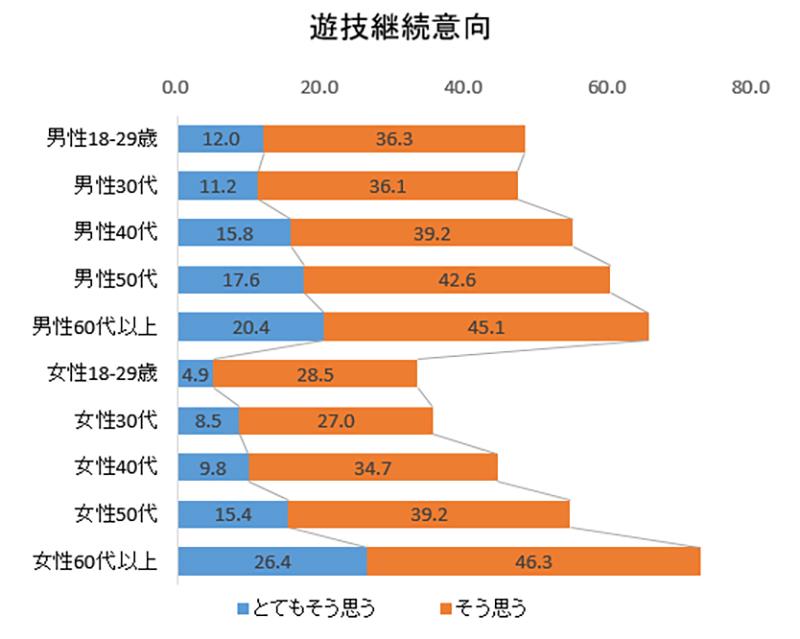 日遊協加盟企業の有するホールおよび九遊連青年部加盟ホールの来店客に店内で実施された「ホール来店客調査」によると、今後もパチンコ・パチスロを継続したい(とてもそう思う+そう思う)と回答した来店客は年代が高いほど多く、男性60代以上層では65.5%、女性60代以上層では72.7%。継続意向者の割合は男性18歳~29歳層では48.3%、30代層では47.3%、女性18歳~29歳層では33.4%、30代層では35.5%にとどまっている。
