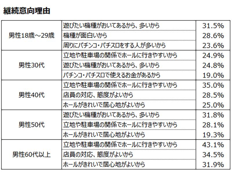 継続意向の理由のTOP3に遊技機に関することが挙がっていないのは、男性40代層と男性60代以上層、女性50代層、女性60代以上層。これらの層に共通するのは「店員の対応、態度が良いから」「ホールがきれいで居心地がよいから」の2つが継続理由の上TOP3に入っていること。