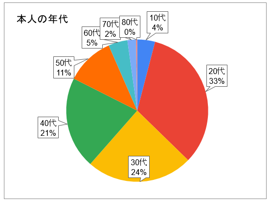 本人からの電話相談2662件のうち男性が2222件(83%)、女性が440件が(17%)で、男女比はおよそ8対2。これは遊技参加者の男女比をおおむね反映している。年代分布は多い順に20代(33%)、30代(24%)、40代(21%)で、年代が上がるにつれて構成比が下がる。