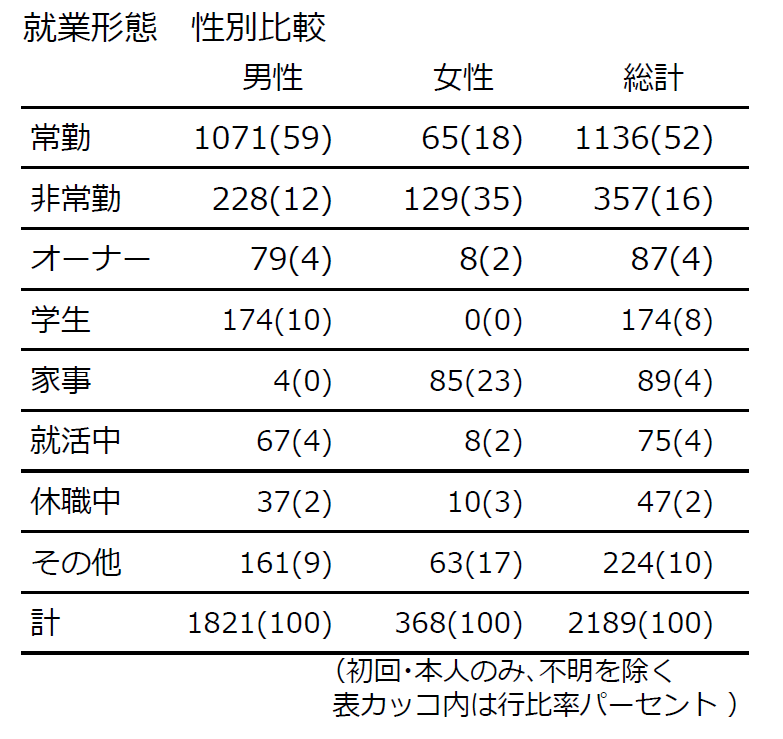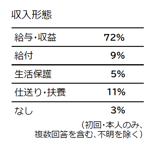 本人の就業形態は、男性では59%が正社員・契約社員などの「常勤」。派遣・アルバイト・パート・就労継続支援利用者などの「非常勤」は12%。計71%が就労者だった。女性では「非常勤」が35%、「常勤」が18%。いわゆる専業主婦であることを示す「家事」が23%。これら相談者の就労形態の構成比は、日本の就業状態の構成比をおおむね反映しており、ある特定の就労形態の人が特に相談につながりやすいということはないようだ。
