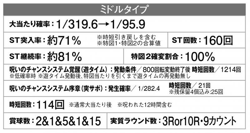大当たり確率1/319.6(高確率時1/95.9)のミドルタイプで、新規則機に完全移行した後も主軸機として収益の柱になってくれる条件を備えている。ST突入率は約71%(※時短引き戻しを含む ※特図1・特図2の合算値)で、遊タイム中、突サポ中、最長114回の時短中(※通常大当たり後 ※呪われた12時間含む)の大当たりは、特図2からの入賞なのですべてSTに突入する。ST継続率は約81%、ST回数160回と非常に打ち気をそそるスペックになっている。
