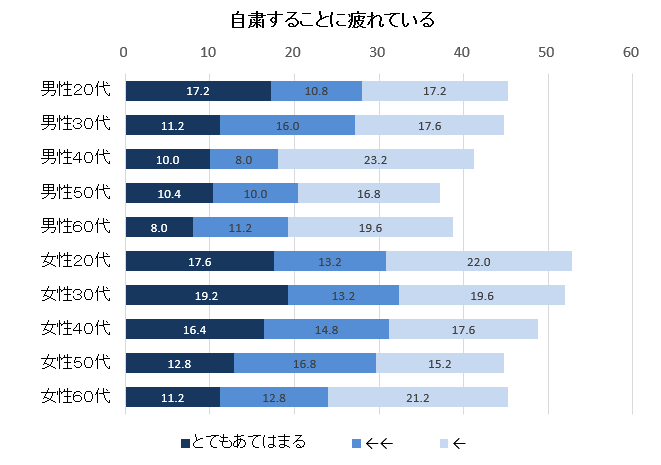4月13日~14日実施の調査(第3回調査)の時点で、すでに半数近い人が自粛疲れを感じている。「外出を自粛することについて疲れている」かどうかについて、「とてもあてはまる」から「全くあてはまらない」の7段階で尋ね、「あてはまる」の回答を合計した(TOP3BOX)値は全体で45.1%。自粛に疲れている人は男性よりも女性のほうが多く、年配層より若年層の方が多い。TOP3BOXのスコアを性・年代で比較すると、男性60代が38.8%であるのに対して、男性20代では45.2%、男性30代では44.8%。