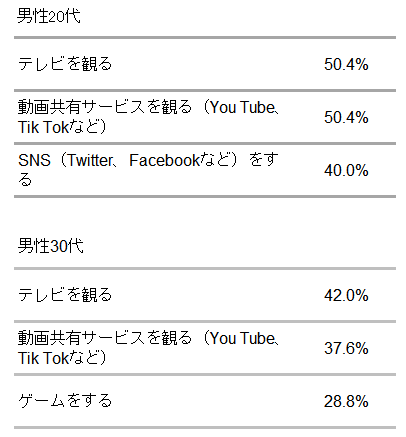若年層の男性に着目すると、20代男性では「テレビを観る」「動画共有サービスを観る(You Tube、Tik Tokなど)」が50.4%で最も多い。次いで「SNS(Twitter、Facebookなど)をする」で40.0%。30代男性では「テレビを観る」が最も多く42.0%。次いで「動画共有サービスを観る(You Tube、Tik Tokなど)」で37.6%、「ゲームをする」で28.8%。