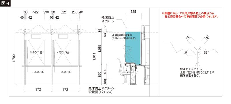 【4】台間隔を0.35m以上取り飛沫防止スクリーンにより遊技客同士の独立性を確保する(図-4)。