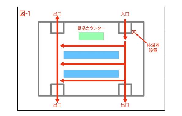 【2】ホール内島通路の動線を一方向通行にすることにより遊技客同士の不要な接触を避ける(図-1)。