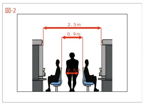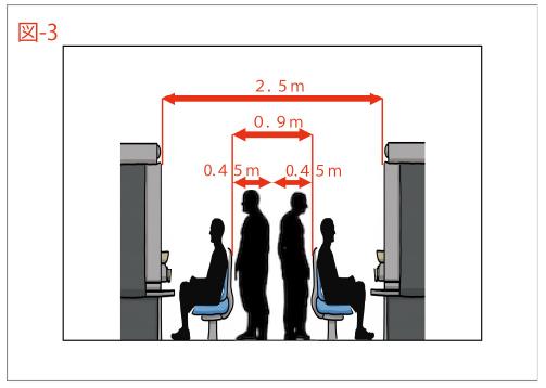 【3】島通路幅を2.5m以上取ることにより遊技客同士の接触を避ける(図-2・図-3・表-1)。