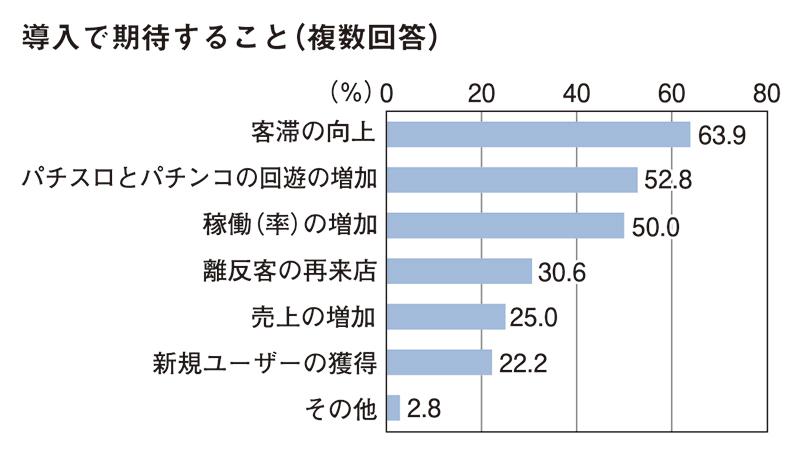 この新解釈基準機をホールはどのように評価しているのか。アミューズメントジャパンがアンケート調査を行ったところ、期待を寄せるとの回答(とても期待している+やや期待している)が77.1%に上った。具体的に期待すること(複数回答)について最も多かったのは「客滞の向上」(63.9%)だった。