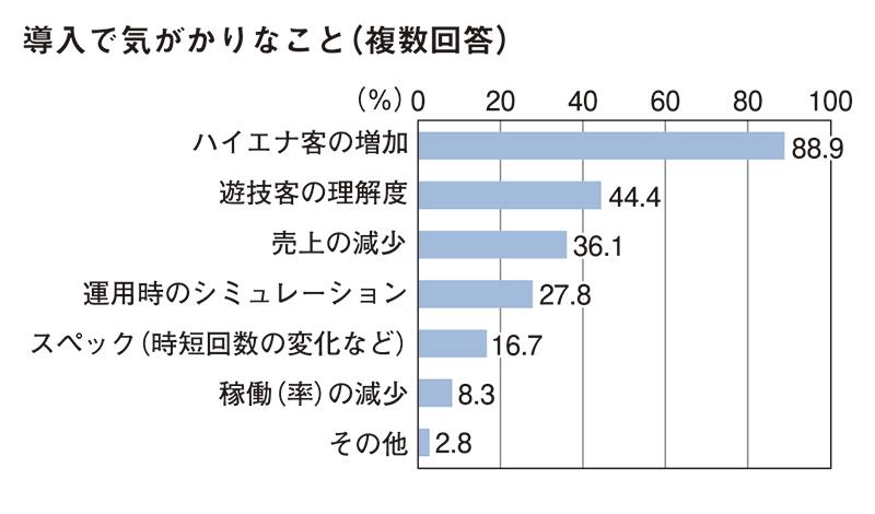 一方、気がかりなことを尋ねたところ、有利な状態に近い台ばかりを狙ういわゆる「ハイエナ客の増加」(88.9%)を懸念する声が多かった。次いで「遊技客の理解度」で44.4%だった。