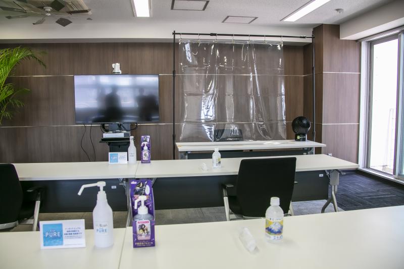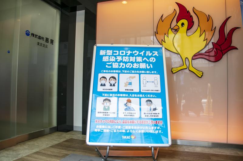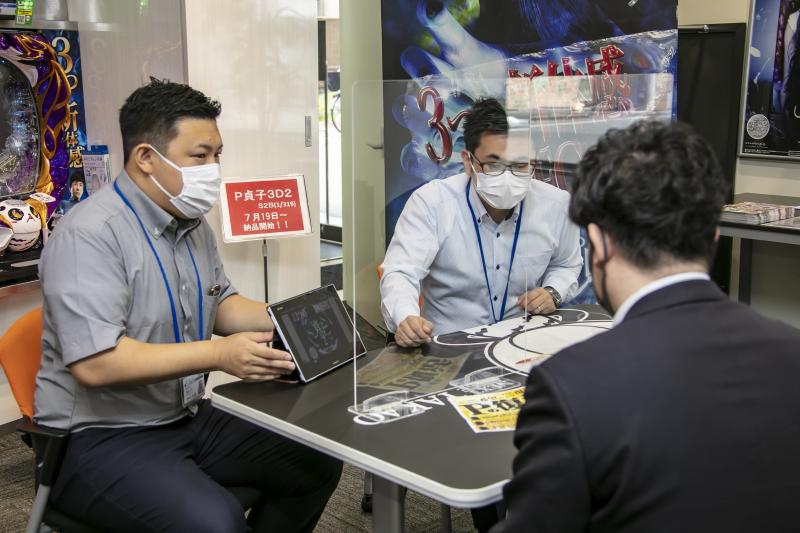 高尾の東京支店ショールームでは入り口に感染症対策実施中の看板を設置。受付には飛沫感染を防止するアクリル板と消毒液、非接触型の体温計を用意した。新機種が設置された島スペースの台間にもアクリルボードを設置、台ごとに使い捨ての手袋を用意したほか、商談スペースとなるテーブル中央にアクリル板を設け、対応する営業マンにはフェイスガードを装着させるなど、徹底した対策を講じた。