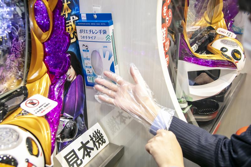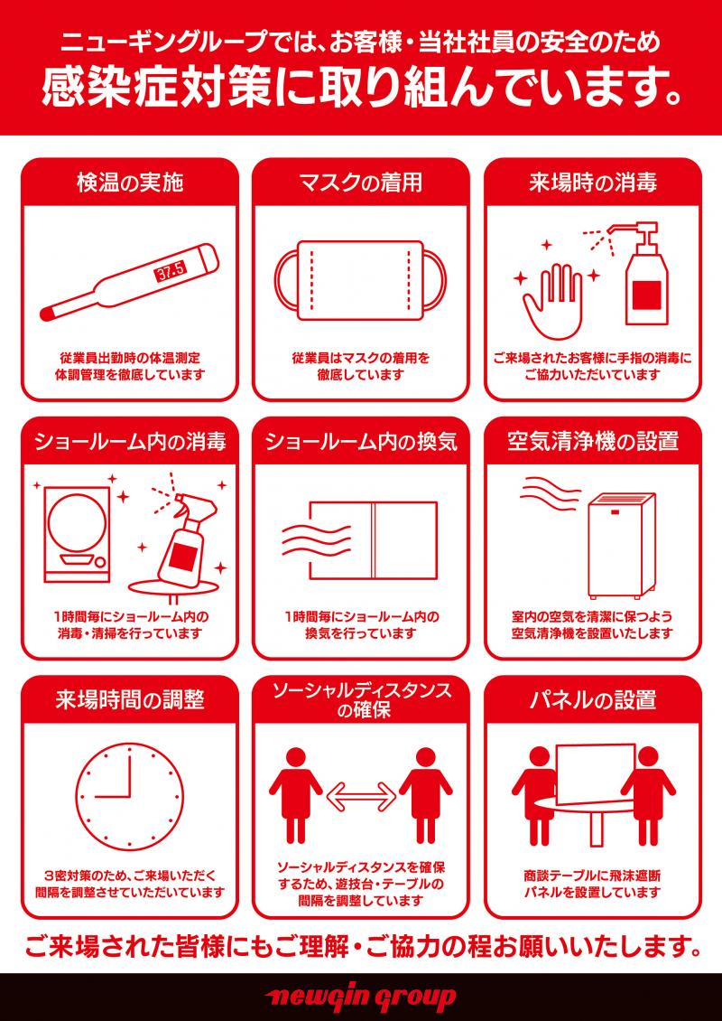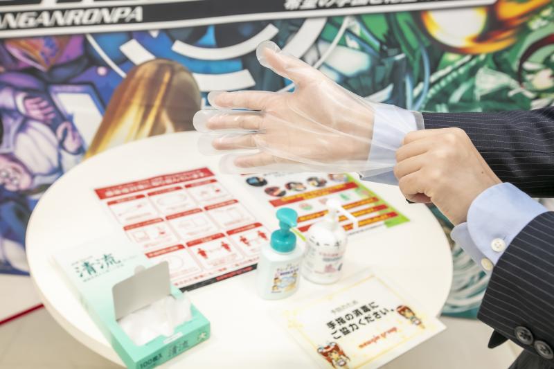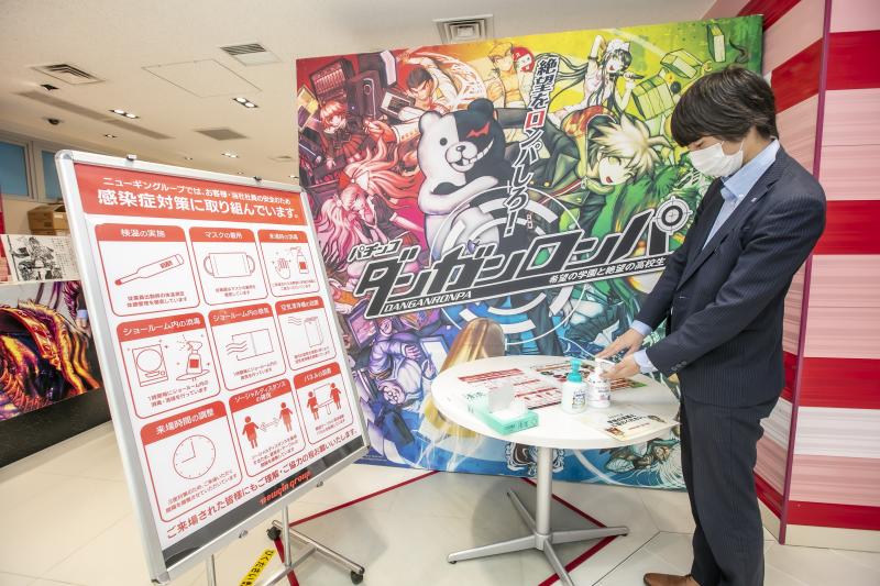 ニューギン販売東京支店では、入り口を入ってすぐの場所に、消毒液と使い捨ての手袋を用意。感染症対策実施中の看板を設置した。受付にはアクリル板、商談用のテーブルは通常時の半分に間引き、アクリル板と消毒液を置いた。消毒液には、商品名と効果が分かるPOPを添えて訪れるホール関係者が安心できる環境を整えた。新機種の台間には飛沫防止用のパーテーションを、台ごとにマイクロファイバークロスと消毒液を準備した。また、試打をする来場者と試打待ちの来訪者のソーシャルディスタンスを確保するため、黄色い線を引いて距離をとる工夫をした。
