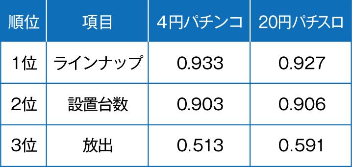 この3つの中で客数アップと最も相関関係が強いのは、「ラインナップ」(下表参照)。つまり、打ちたい台があるから来店する人が一番多いのだ。逆に相関関係が弱いのが「放出」だ。「ラインナップ」と比較すると、「放出」の客数アップとの相関関係は0・4ポイント以上開いている。この差は大きく、パチンコ店運営で特に重要なのは、「どの機種を入れるか/残すか」という機種を選定する目利きだということが分かる。