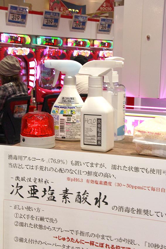 「ちょうど除菌・消毒剤が品薄で薬局などでも手に入りにくい時期だったので、多くの方に喜んでいただけました」(篠嵜康博店長)。5月16日の営業再開後は、店内で遊技機や部備品の清掃に使っている。また、日時を決め敷地内にブースを設置、来店客や地域住民に配布する社会貢献活動も継続している。
