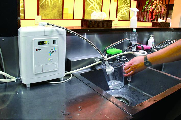 生成装置『ウェルクリン・テ・ネオ』でできる次亜塩素酸水は、pH値5・0~6・5、有効塩素濃度30~50mg/L(ppm)。やや多めの量を付け、5分程度そのままにしておくと菌やウイルスが99・9%不活性化し、人体にも安全だ。あとは、乾いた布で拭き取れば良い。1時間で156ℓの次亜塩素酸水が生成できる。