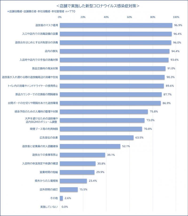 20の項目を提示して、取り組んでいる感染予防対策を尋ねたところ、実施しているものとして上位に挙がったのは「遊技客のマスク着用」(96.9%)、「入口や店内での消毒設備の設置」(96.4%)、「遊技台をはじめとする共有部分の消毒」(96.0%)だった。