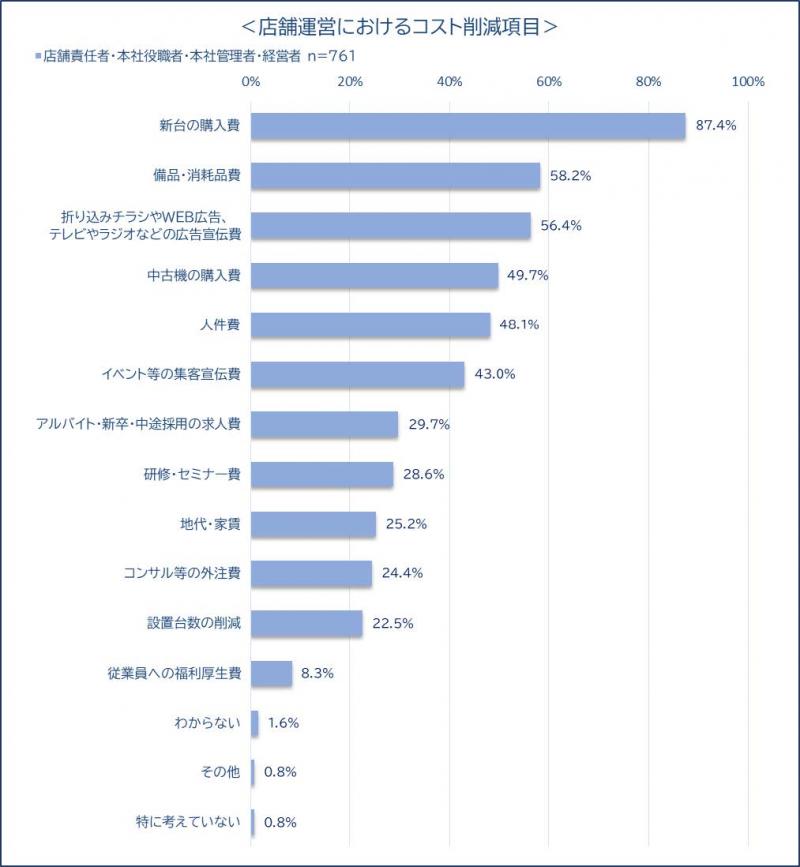 今後のコスト削減予定の項目については、店舗責任者・本社役職者・本社管理者・経営者層(n=761)の87.4%が「新台の購入費」を挙げた。次いで多かったのは「備品・消耗品費」(58.2%)、「広告宣伝費」(56.4%)。