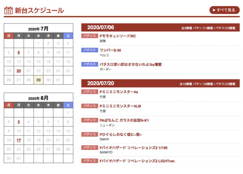 新たに搭載した「新台スケジュール」では、カレンダーと機種リストの連動で新機種の導入日がひと目でわかり、どの機種がいつホールに導入されるかが手軽にわかるようになった。「すべてを見る」をクリックすると、2カ月前から3カ月後までの6カ月間の導入機種情報が機種画像付きで確認できるページも用意した。