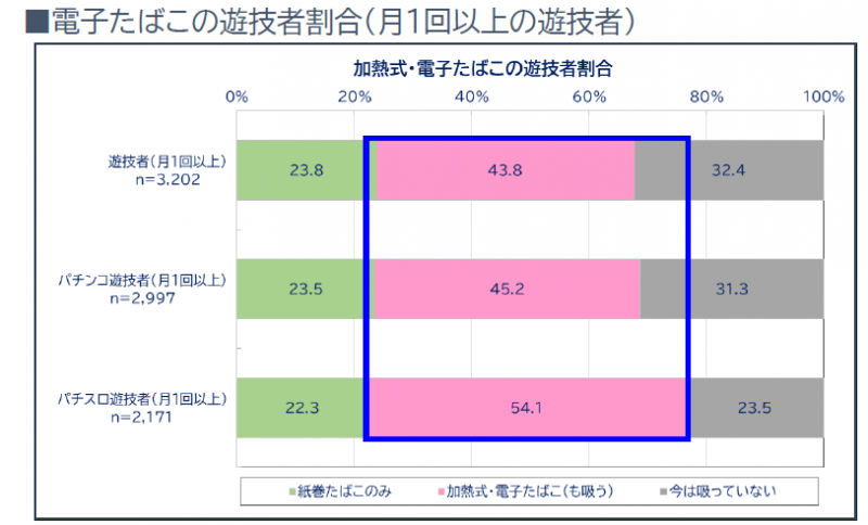 そして、広義の加熱式・電子たばこユーザーの割合は、パチンコ遊技者よりパチスロ遊技者で高く、54.1%を占めた。