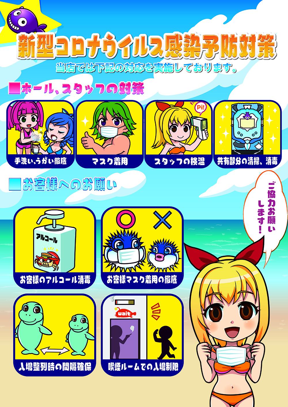 三洋では「新型コロナウイルス感染予防対策のアピールとして、店舗チラシや店内装飾などに、アイキャッチとなる海物語キャラクターの素材集をぜひご活用ください」と呼びかけている。