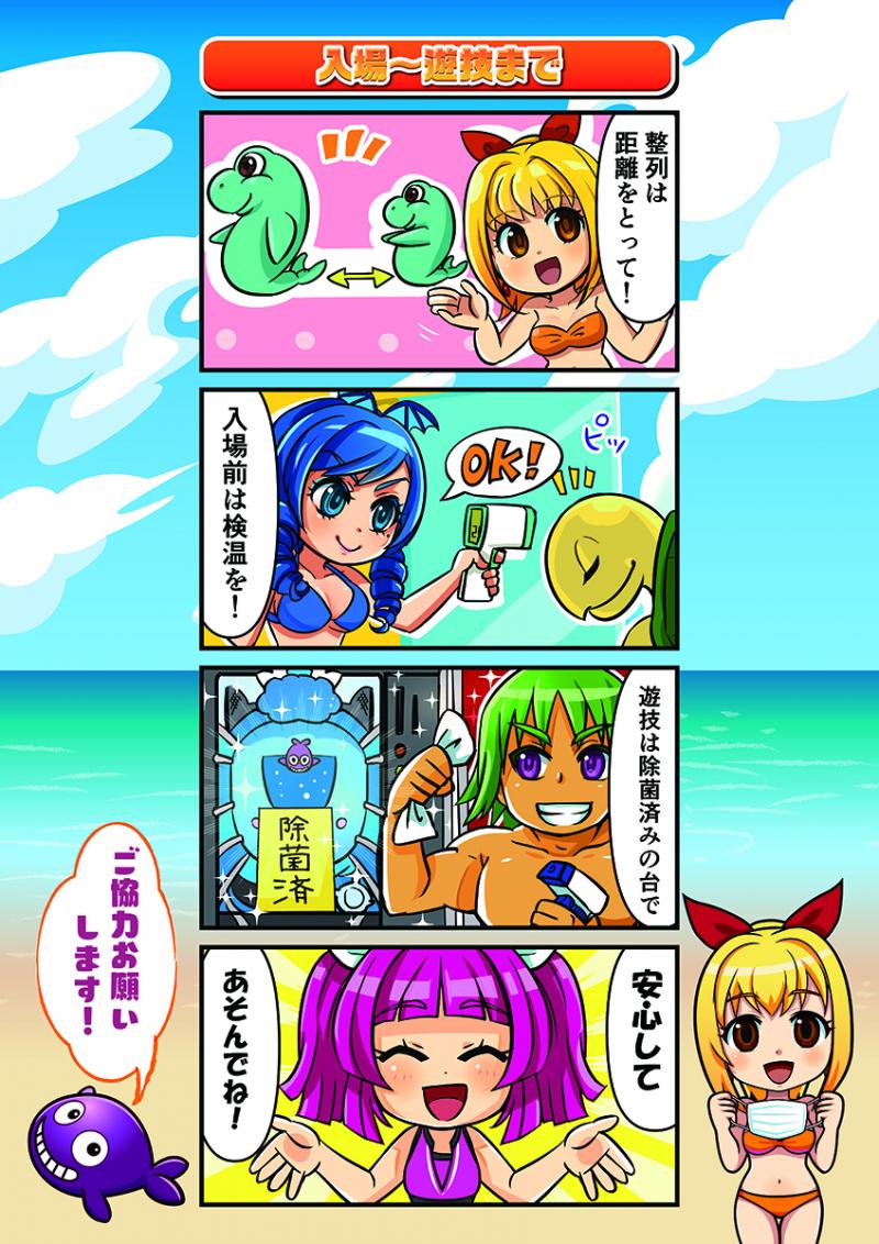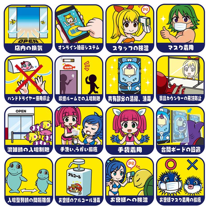 配布素材はパチンコ・パチスロ産業21世紀会が制定した「パチンコ・パチスロ店営業における新型コロナウイルス感染症の拡大予防ガイドライン」をもとに作成し、マスク着用や共有部分の清掃など16項目のアイコン。幅広い年代のユーザーに利用シーンをイメージしてもらえるように、入場から遊技までの流れや喫煙スペースの利用方法などを描いた4コマ漫画を3種類作成した。