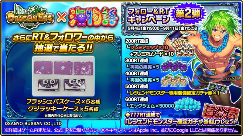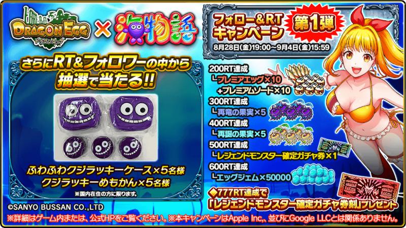 ドラゴンエッグの公式Twitterアカウント「[公式]ドラゴンエッグ◎オムレット(@dragonegg_rudel)」をフォローして、キャンペーン対象ツイートをリツイートすると、リツイート数に応じてゲーム内アイテムが全ユーザーにプレゼントされる。リツイート&フォローした人の中から抽選で「クジラッキー」関連グッズが当たるキャンペーンも実施する。