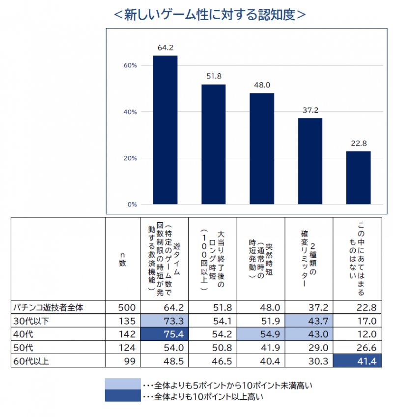 調査時点(7月29日)の各ゲーム性の認知度は、週1回以上の遊技者では、「遊タイム」が69.7%、「大当たり終了後のロング時短(100回以上)」が53.8%、「突然時短(通常時の時短発動)」が53.2%、「2種類の確変リミッター」が39.7%。見方を変えれば、「遊タイム」の他は、高頻度遊技者においても半数に認知されていない。ただし、シーズリサーチは「認知度と遊技動機の高さには相関関係が見られた」としており、さらに認知度が高まれば、支持も高まると考えられる。