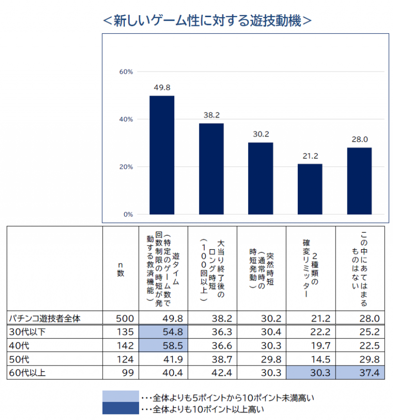 シーズリサーチが全国のパチンコ遊技者を対象に実施した「新しいゲーム性」についてのアンケート調査によると、提示した4つのゲーム性すべてについて、月1回程度の頻度の遊技者よりも週1回以上の頻度の遊技者の認知度が高く、週1回以上の頻度の遊技者の7割が「遊タイム(特定のゲーム数で回数制限の時短が発動する救済機能)」を認知し、5割がこれを遊技動機になると評価した。