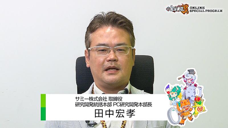この「P真・北斗無双 第3章」~ONLINE SPECIAL PROGRAM~では、開発プロデューサーによる製品説明や本邦初公開となるプロモーション映像を放映。冒頭ではサミー研究開発統括本部 PC研究開発本部長の田中宏孝取締役が挨拶を寄せた。