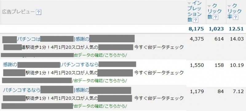 下記の画像は兵庫県のある法人様の実際のYahoo!広告の管理画面です。了承を得て掲載しておりますが、広告文の店名や駅名部分のみ非表示しております。また、実際の数値ですので3項目までの数値のみ公開しております。実際の管理画面ではこれら以外にも費用、クリック単価、コンバージョン、上位掲載率など多くの項目を分析できます。