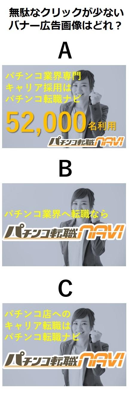 Cはパチンコ店へのキャリア転職というキーワードが入っており、Aよりは簡素ですので伝わりやすくなっています。なおかつ、ペルソナした人向けの内容となっています。また、パチンコ転職ナビのロゴも中央に大きく表示しているため、このロゴに何度も目に触れることによって親近効果が生まれ認知されやすくなります。そのため、この3つの中では一番効果的な画像といえます。