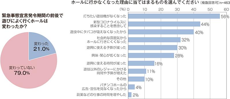自由回答に「テレワークが継続して平日の仕事帰りに行かなくなった」「ホールの休業中にハマったスマホゲームに課金するようになった」といった意見がみられるように、緊急事態宣言前とは異なったライフスタイルになったことや、新しいレジャーに時間を費やすようになったことも影響していることが分かった。