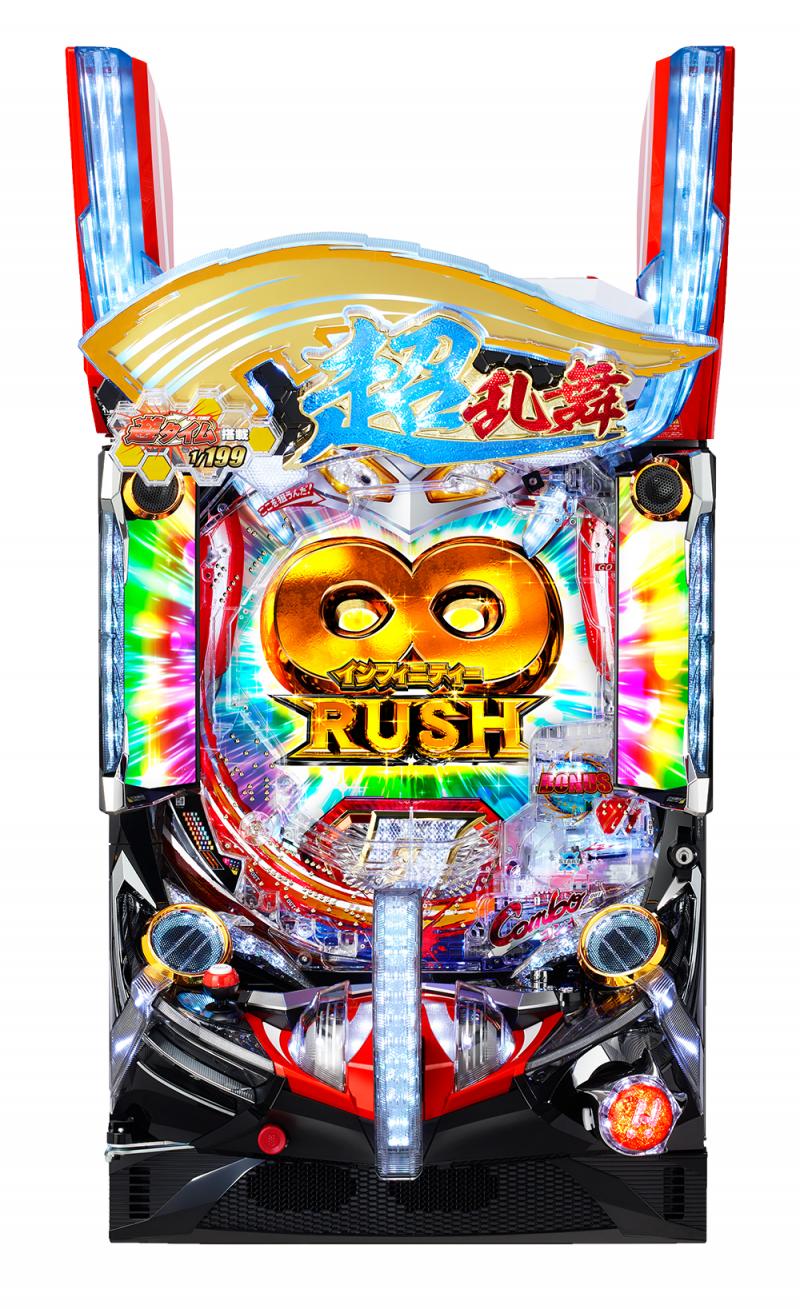 「∞RUSH」突入後の大当たりは、時短95回の「超乱舞RUSH」と時短496回の「∞RUSH」のみの振り分けとなり、継続率は約90%。この「超乱舞システム」が異次元の高継続ループを呼び込む。