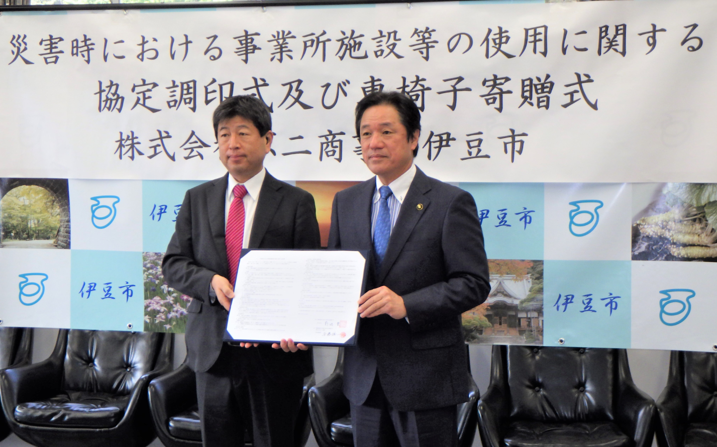 26日に伊豆市役所で行われた協定書調印式では、同社から市に車いす1台が寄贈された。