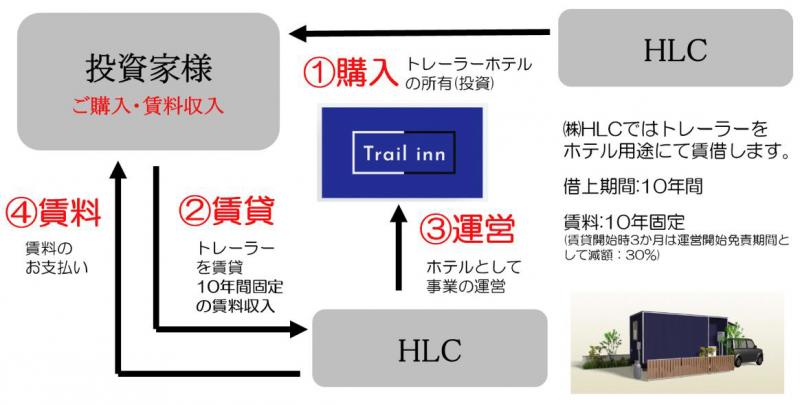 この事業は、『Trail inn』を購入する投資家を募集するもの。投資家は、購入した物件をホテル営業者であるヒーローライフカンパニーに賃貸、事業収益の一部を賃料として得ることができる。