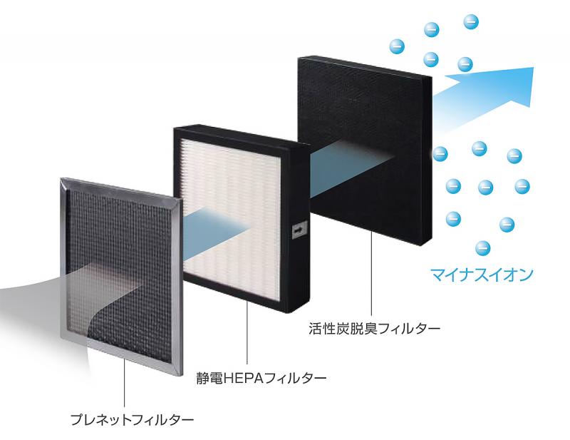 「静電HEPAフィルター」は、新型コロナウイルス・インフルエンザウイルス、菌、花粉やダニなどのアレル物質からPM2.5まで確実にキャッチする。NASA(アメリカ航空宇宙局)でも、医療・製薬業界のクリーンルームでも使用されており信頼性は抜群だ。