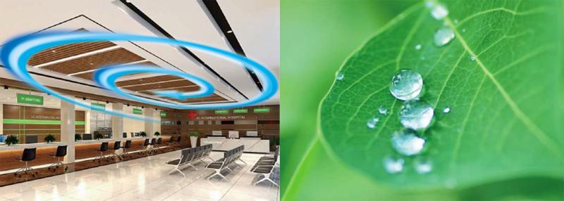 毎分21,500ℓの大風量で空気を徹底的に清浄し、大量の高濃度マイナスイオン(199万個/cc以上)を循環させ、空調効率と換気効率が大幅に向上する。