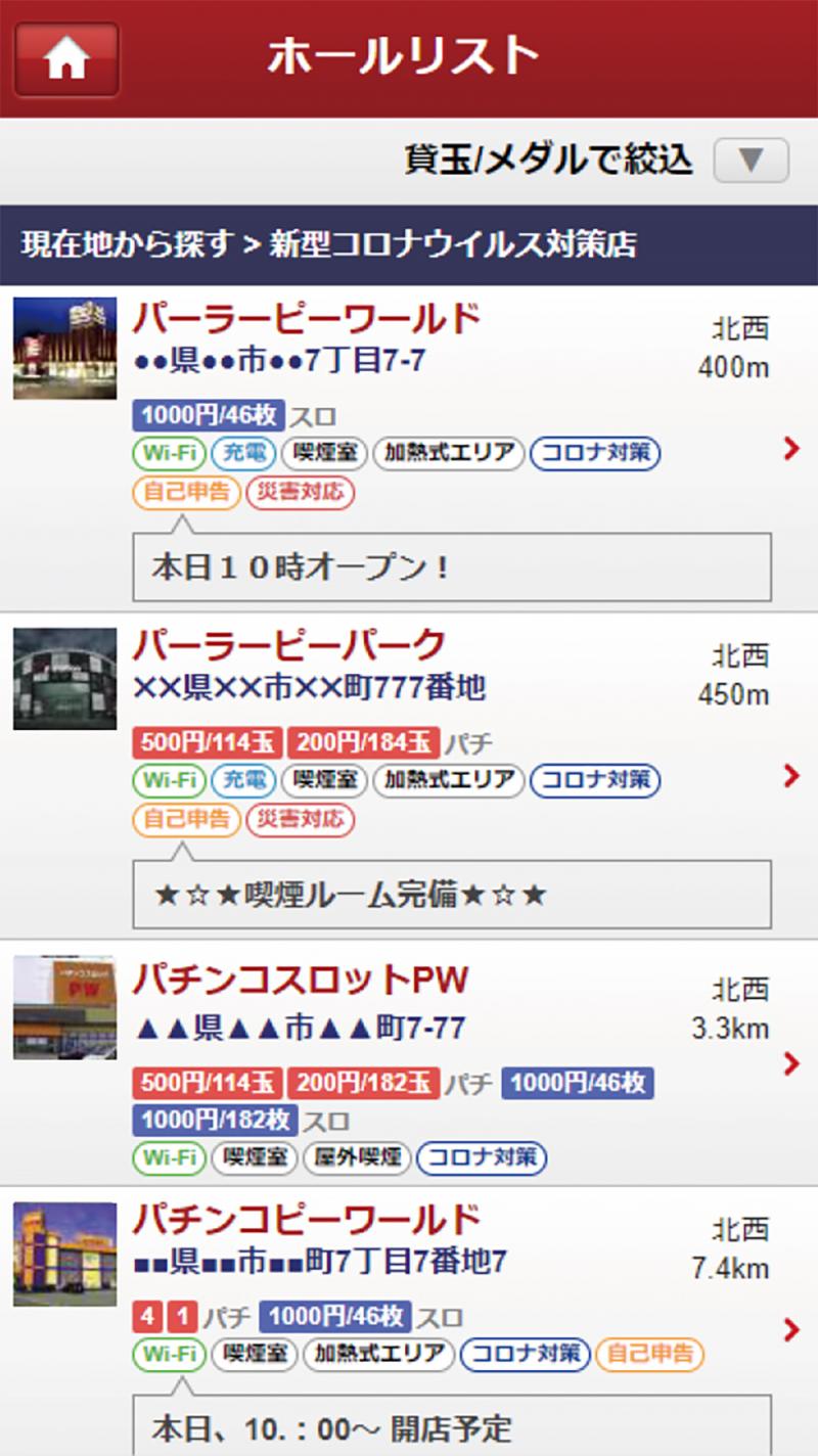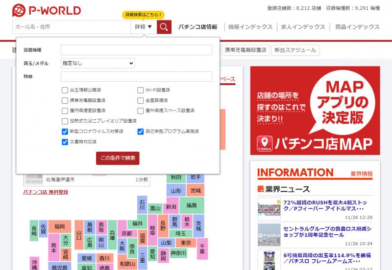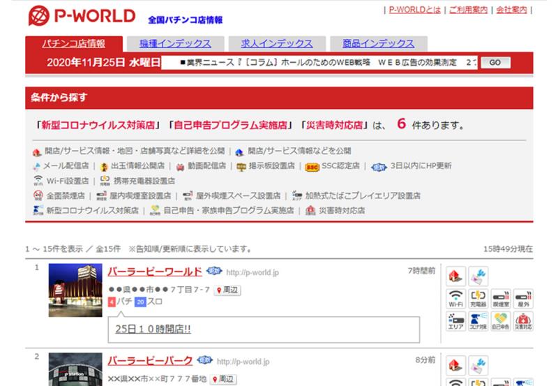 ピーワールドが運営するWebサイト「P-WORLD」は11月25日から、各店舗ページに「安全対策」に関する項目を追加した。これにより店舗検索時に「新型コロナウイルス対策店」「自己申告プログラム実施店」「災害時対応店」での絞り込みが可能になった。