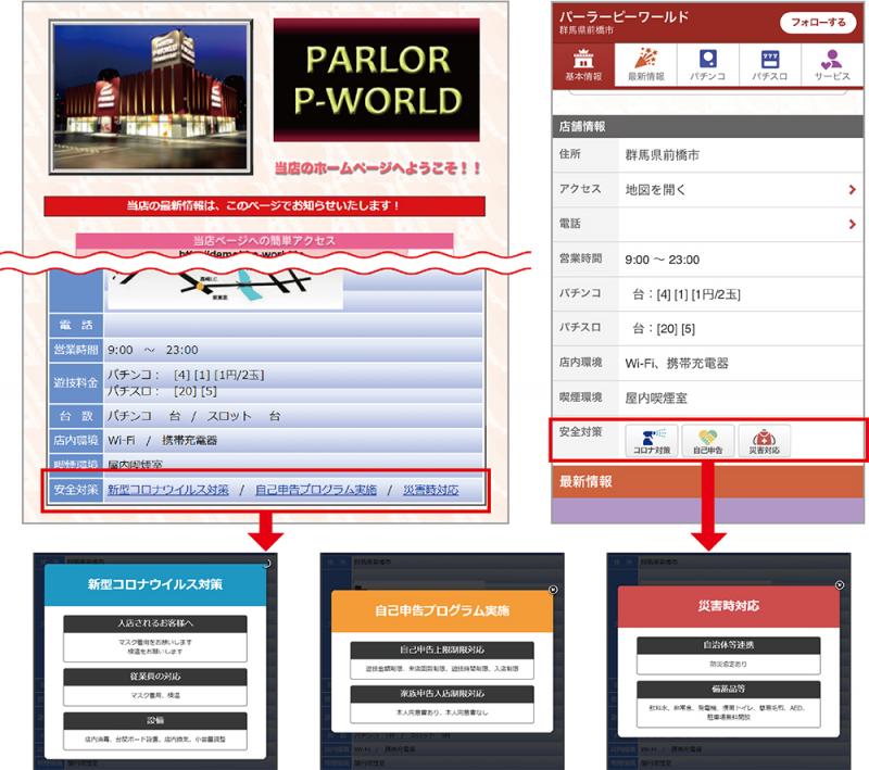 P-WORLDの店舗ページに「安全対策」項目