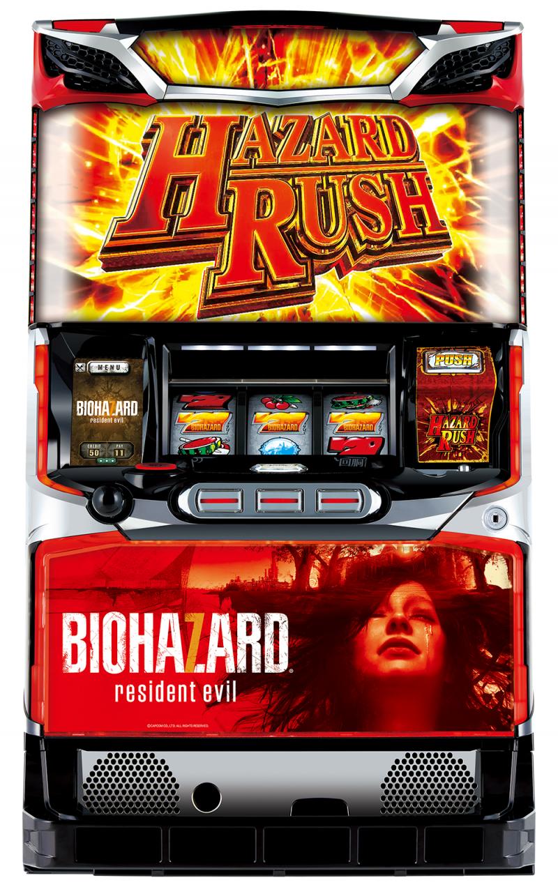 本機はカプコンとの業務提携第一弾となるパチスロ。試打会の冒頭では、同社の長谷川崇彦執行役員とカプコングループ・アデリオンの眞仁田達弘社長からのメッセージ動画が上映された。長谷川執行役員は「19年1月に業務提携を発表してから約2年が経ち、ようやく提携第一弾をお披露目することができた」と話し、眞仁田社長は機種のポイントとして「プレイヤーの皆様に感じていただきたいのは、出玉の塊が取れるところ、そして次の当たりが早いところ。この2つを両立させ、なおかつ高純増を実現した。BIOHAZARDシリーズの特徴は怖さ。その恐怖感や驚きが、出玉になり喜びに変わるところにこだわった」と説明した。