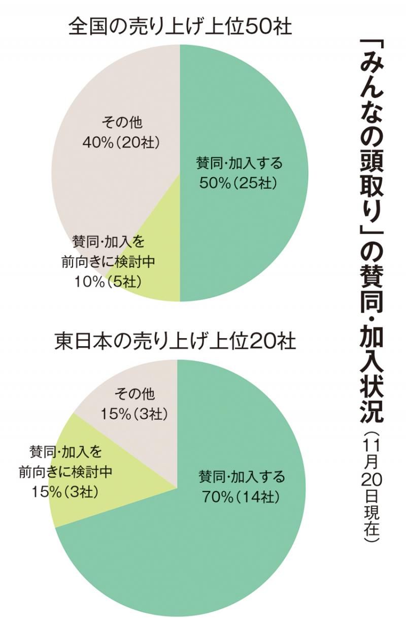 東日本の売り上げ上位20社を見てみよう。賛同し加入の意思を示しているのは14社で、70%にも達している。さらに3社(15%)が賛同し加入を前向きに検討中だ。